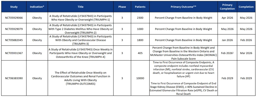 目前Retatrutide正在开展多项TRIUMPH 3期临床试验,旨在评估Retatrutide在肥胖或超重患者中的安全性和有效性,包括TRIUMPH 1-4等(图7)[6]。