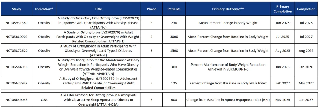 Orforglipron目前正在临床上开展多项试验,包括针对肥胖症的3期ATTAIN-1和ATTAIN-2试验、针对2型糖尿病患者的3期临床试验以及针对阻塞性睡眠呼吸暂停的3期临床试验等(图10和图11)。