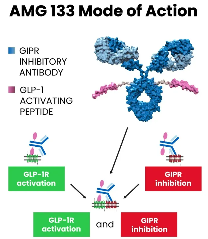 MariTide是由安进(Amgen)开发的一种新型双特异性分子药物,属于抗体-多肽偶联物(Peptibody)。与其它GLP-1类激动剂不同,它是葡萄糖依赖性促胰岛素多肽受体(GIPR)拮抗剂和胰高血糖素样肽-1(GLP-1)受体激动剂(图12)。