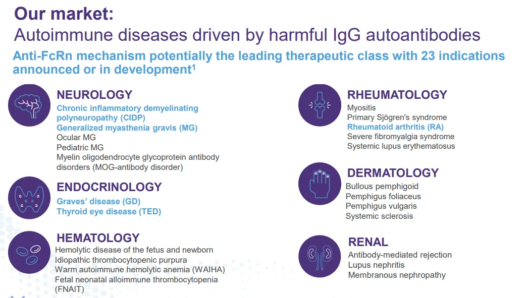 Immunovant/Roivant把希望寄托在靶向FcRn(新生儿 Fc 受体)的药物IMVT-1402和Batoclimab,它们是一类新型的免疫调节药物,主要用于治疗 IgG 介导的自身免疫性疾病,IMVT-1402有望成为Best-in-class的靶向FcRn药物。