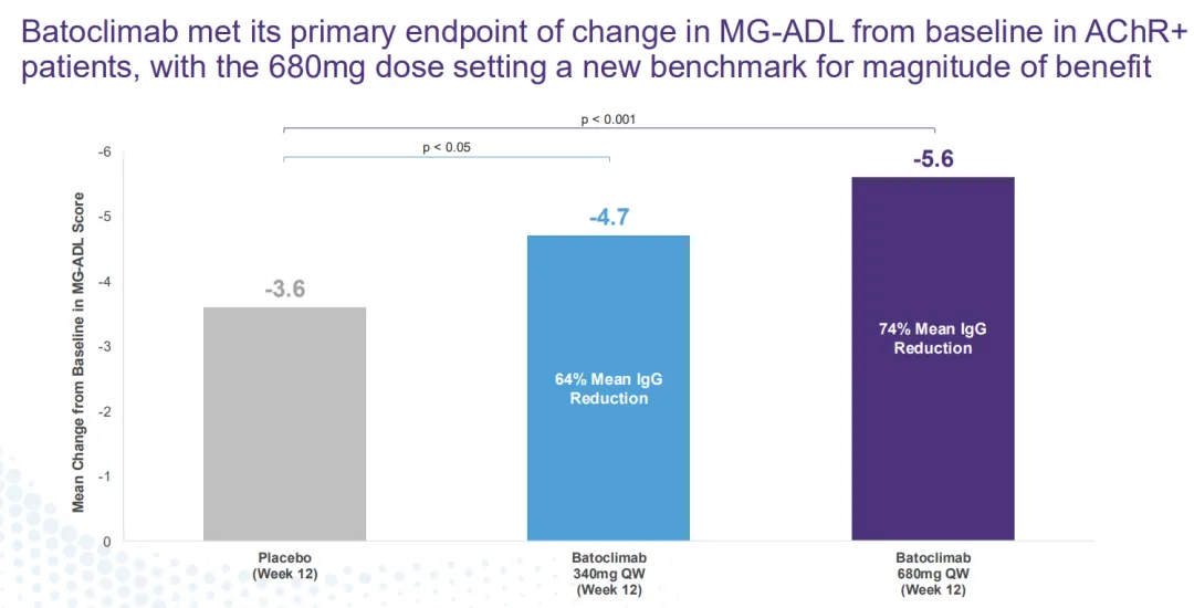 Batoclimab治疗MG的3期研究结果显示:Batoclimab组在12周时达到了AChR人群中MG-ADL相对于基线变化的主要终点,其中高剂量组提高了5.6分(平均IgG减少74%),低剂量组提高了4.7分(平均 IgG 减少 64%)(图20)。