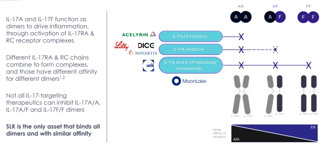 Sonelokimab(SLK,M1095)是由MoonLake Immunotherapeutics研发的一种~40 kDa人源化纳米抗体,由三个VHH结构域组成,这些结构域通过灵活的甘氨酸-丝氨酸间隔区共价连接。