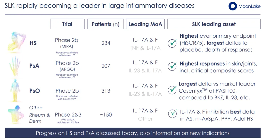 Sonelokimab正在评估化脓性汗腺炎(HS)和银屑病关节炎(PsA)这两个主要适应症,同时,MoonLake也在寻求皮肤病学和风湿病学的其他适应症(图23)。