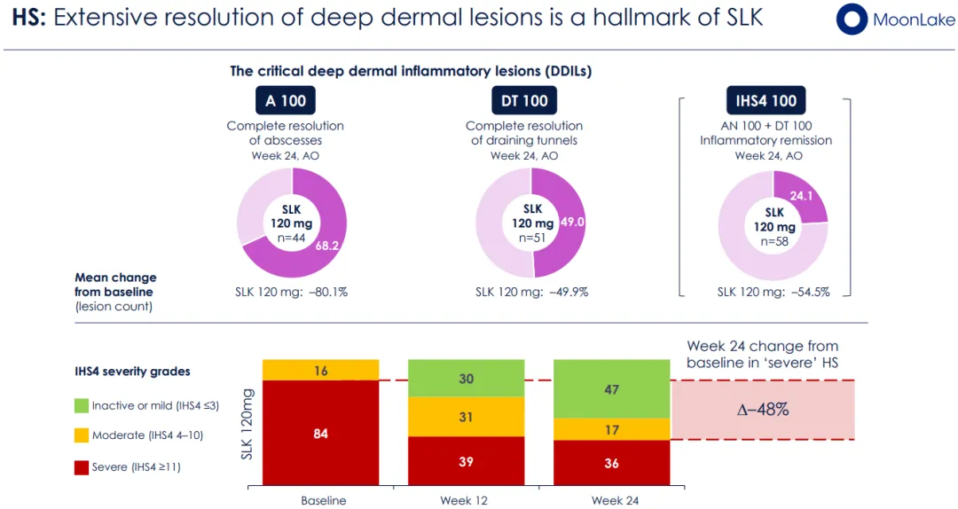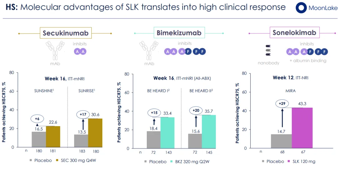 2023 年 6 月,sonelokimab 的2期MIRA 试验 (NCT05322473) 在 12 周时的顶线结果显示,该试验达到了其主要终点,即化脓性汗腺炎临床反应 (HiSCR)75,与其他临床试验中使用的 HiSCR50 指标相比,该指标的临床反应指标更高,树立了一个里程碑(图24)。