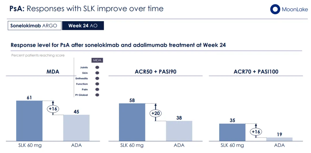 Sonelokimab的ARGO试验结果显示在所有关键结局中均观察到显著改善,包括约60%的sonelokimab治疗患者在第24周达到美国风湿病学会(ACR)50 缓解和最小疾病活动度(MDA)(图27)。注:ACR 50 是美国风湿病学会(ACR)制定的用于评估类风湿关节炎(RA)患者治疗反应的标准之一。它表示患者在治疗后,疾病活动度相比基线改善了 50% 或以上。