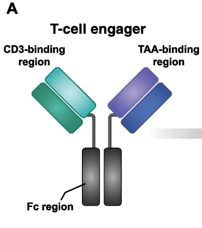 先从机制和结构开始,与传统的双抗结构不同,在我们所熟悉的抗体结构里面,应该是一个Y型的四肽链,包含Fab段(抗体与抗原结合的片段)与Fc段(抗体与效应分子或者细胞相互作用的部位)。而我们一般熟悉的双抗来说,也应该是如下图所示的对此结构,其中一端结合CD3,另一端结合抗原。