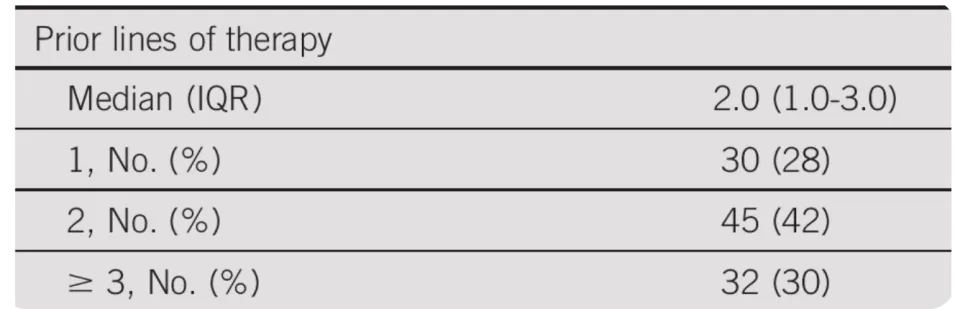 再梳理它的临床试验数据。2023年在ASCO上公布了它的临床I期数据,总共107名患者接受了试验,超过70%的患者接受过两线治疗,25%的患者对铂类药物无效,50%的患者接受过PD-1/PD-L1抑制剂治疗。对于SCLC患者而言,基线上其实非常后线了。此外,93%的患者发生了转移。