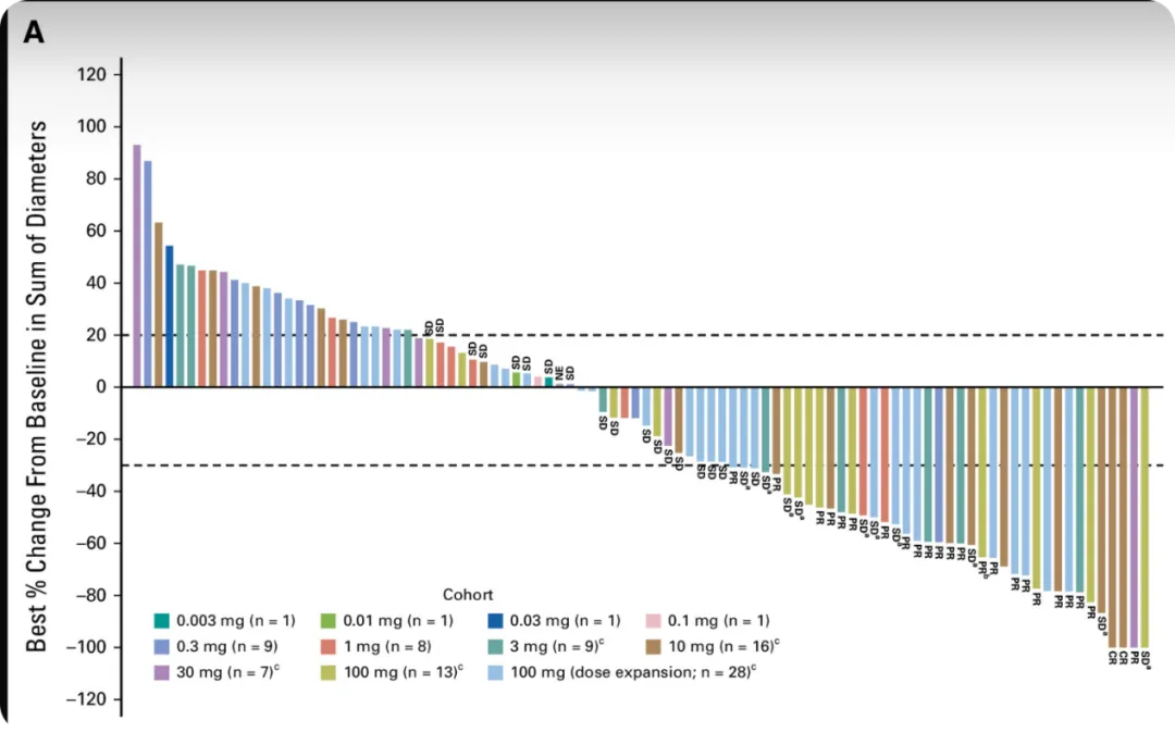 最终疗效方面,确认的ORR达到了23.4%,包含了2名CR和25名PR,这对于SCLC而言已经非常不容易了,DCR为51.4%。具体如下图所示,我们可以看到在1mg时开始产生多名PR,随着剂量递增,患者反应率也变高。最终mPFS数据为3.7个月,mOS数据为13.2个月。当然,对于临床I期试验而言,剂量之间差距太大,mPFS和OS不应该是我们太关心的。只是说在临床I期试验中,对于它的疗效有了部分的确认,然后就是定后面临床试验的剂量了。