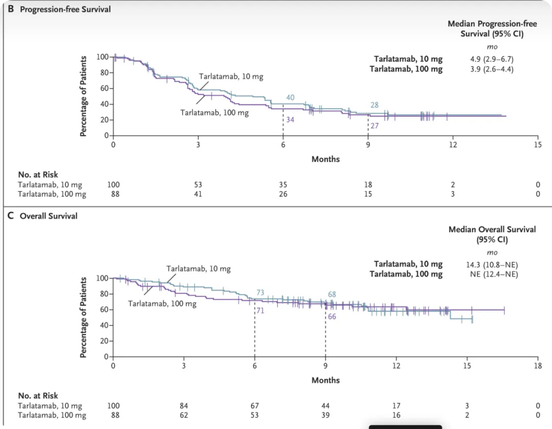 安进的Tarlatamab是基于II期DeLLphi-301试验获得加速批准的。该次试验剂量分为两组,10mg和100mg,10mg组的ORR达到了40%,100mg组的ORR达到了32%,在68名达到客观缓解的患者中,40名患者(59%)的缓解持续时间至少为6个月,20名患者(29%)的缓解持续时间至少为9个月。PFS和OS曲线和数据如图所示,可以看到10mg组目前来看是最佳的疗效:mPFS达到了4.9个月,OS达到了14.3个月。