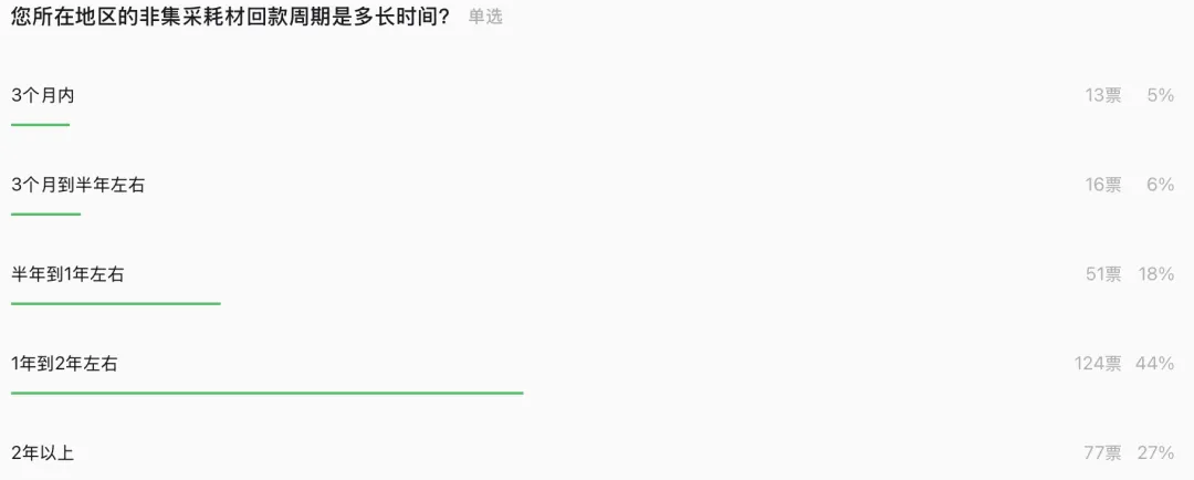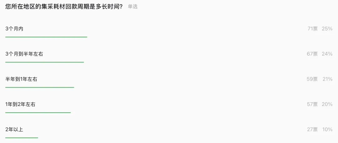 此前,赛柏蓝器械曾对耗材回款周期展开小范围调研,共281人参与投票。投票结果显示,集采耗材回款情况明显好于非集采耗材,49%的参与者表示,集采耗材回款周期能控制在半年内,但也有84位参与者表示,其业务相关耗材回款周期来到了1年以上。