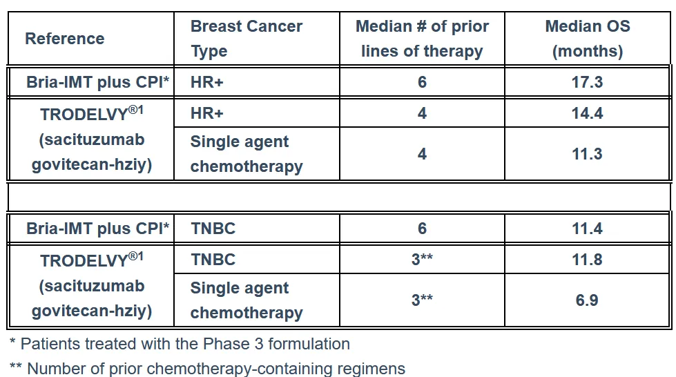在该公司针对晚期转移性乳腺癌的2期临床试验中,共有37名患者接受Bria-IMT治疗,其中25名被确认为HR+乳腺癌患者。分析显示,这25名患者的中位总生存期(17.3个月)优于当前ADC标准治疗Trodelvy(14.4个月)。在三阴性乳腺癌(TNBC)患者中,Bria-IMT联合免疫检查点抑制剂治疗方案的生存数据则与Trodelvy相当,但依然显著优于化疗治疗组,生存率提高约70%。截至目前,尚未报告因Bria-IMT导致的治疗中断事件。