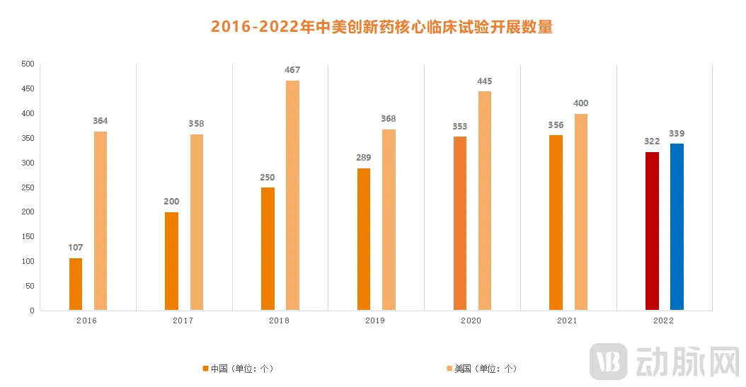 图2.2016-2022年中美创新药核心临床试验开展数量(数据来源:医药魔方)