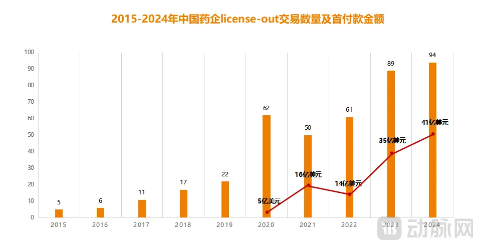 近日,医药魔方与清华大学联合发布了一项重磅报告,数据显示,2024年我国药企共完成94笔license-out交易,总交易金额高达519亿美元,同比增长26%;其中首付款41亿美元,同比上涨16%。