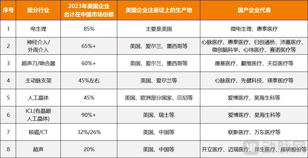 图7. 中国医疗器械细分领域美国企业市场份额情况(数据来源:东方财富证券)