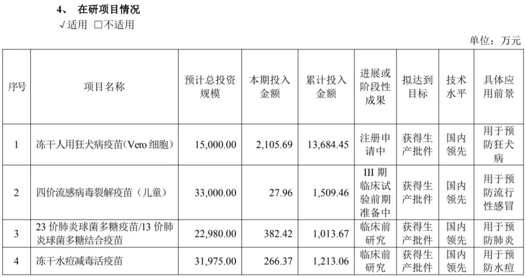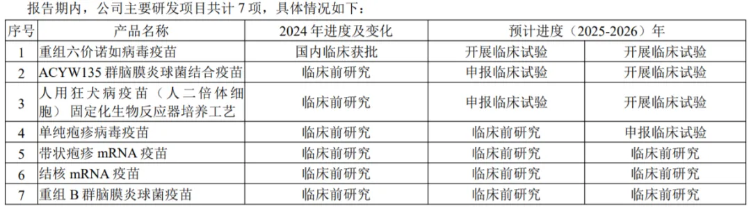 2025年,公司将集中力量重点推进部分重点项目研发进度。目前公司的狂犬病疫苗产品完成Ⅲ期临床试验,正在进行产品注册申报工作;四价流感病毒裂解疫苗(儿童)已完成I期临床试验,2025年已正式启动Ⅲ期临床试验。另外,公司还聚焦水痘疫苗、带状疱疹疫苗和肺炎球菌疫苗等重大传染病防治领域,优化并扩展产品管线布局。以求摆脱单一产品依赖的问题。