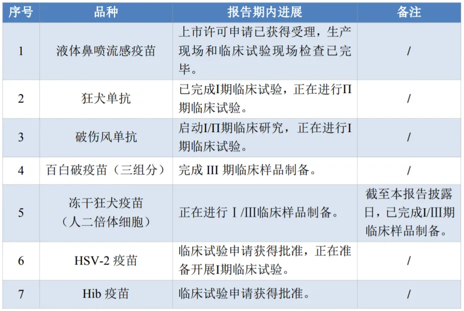未来,公司将不断完善在成人疫苗、多联多价疫苗、治疗性疫苗等创新产品管线以及mRNA技术等新技术路线的布局,巩固和发展公司核心竞争力。截至报告披露日,公司的主要在研管线进展如下:
