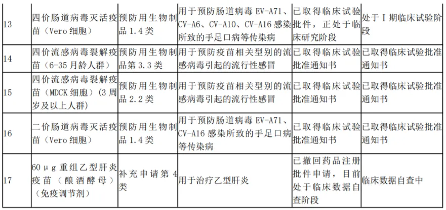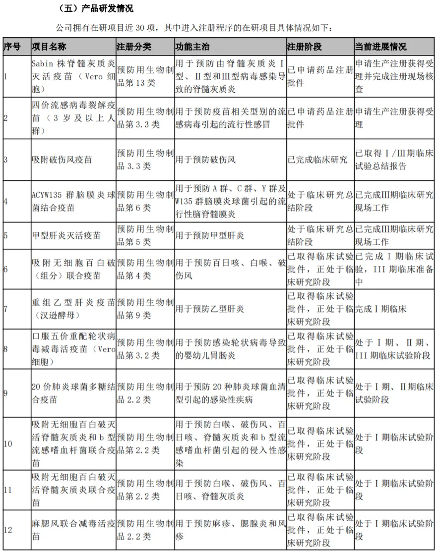 目前,公司核心产品包括重组乙肝疫苗(市占率约30%)、13价肺炎结合疫苗(2023年获批)、四联苗(吸附无细胞百白破-b型流感嗜血杆菌联合疫苗)等。公司拥有在研项目近30项,其中进入注册程序的在研项目具体情况如下: