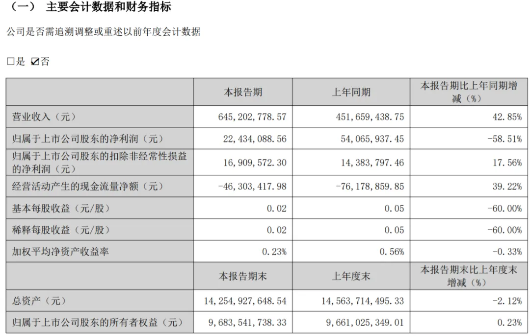 4月21日,康泰生物发布2025年一季报:营收6.45亿元,同比增长42.85%;归母净利润为0.22亿元,同比下降58.51%;不过归母净扣非净利润同比增长17.56%;研发费用1.21亿元。其中,营收变动主要系报告期内销售数量增加所致。