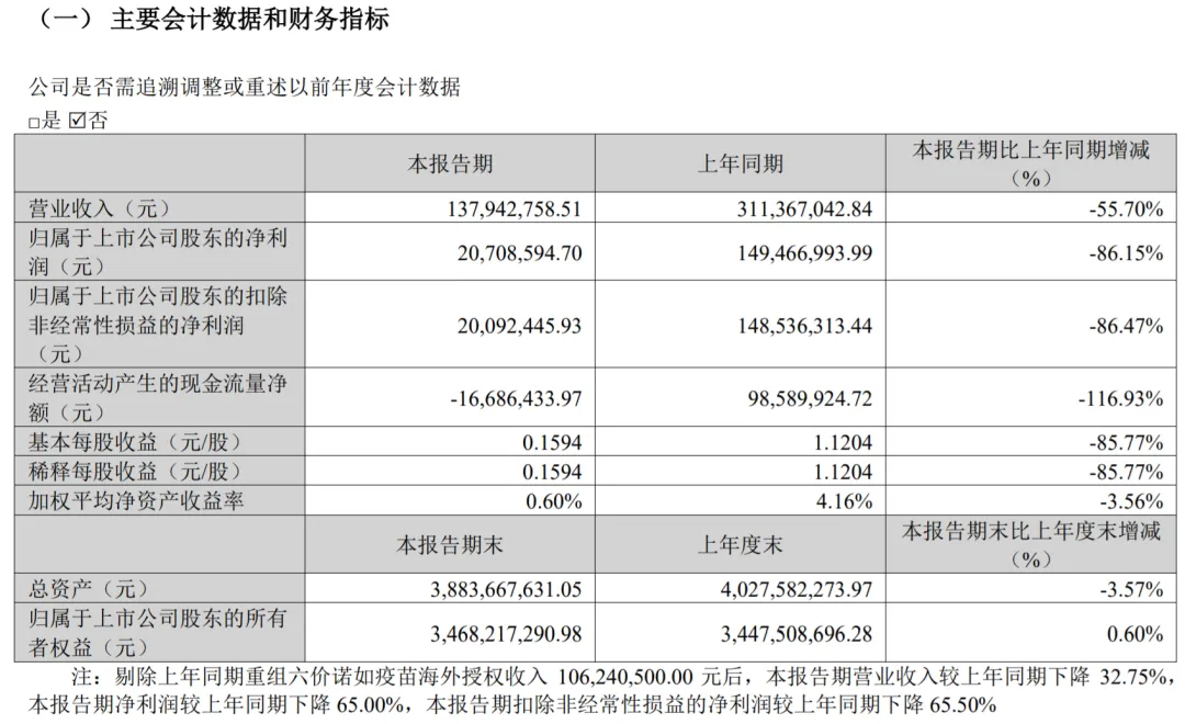 4月19日,康华生物发布2025年一季报:营收1.38亿元,同比下降55.70%;归母净利润为0.21亿元,同比下降86.15%;研发费用0.25亿元。其中,营收下降主要系报告期内公司海外授权及疫苗销售收入减少所致。