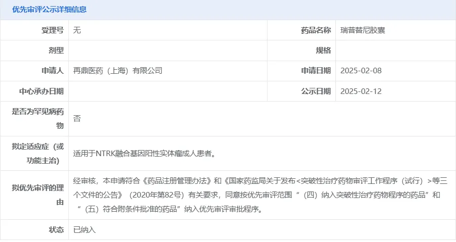 成人患者。瑞普替尼本次提交的补充 NDA 适应症为 NTRK 阳性实体瘤,该适应症已在今年 2 月被 CDE 纳入优先审评。今年 3