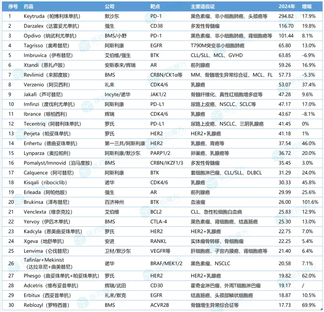 从公司层面来看,阿斯利康的肿瘤业务增长势头迅猛,核心产品的强劲表现为其提供了有力支撑。BMS在实体瘤与血液瘤两大板块齐头并进,构建了庞大的产品矩阵。2024年全球畅销肿瘤药TOP30的企业分布