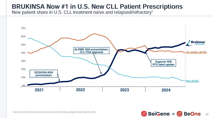 class分子,进而迅速在市场上建立起了稳固的地位。目前,Brukinsa已成为全球获批适应症最广泛的BTK抑制剂,正以强劲的扩张势头追赶Calquence(阿可替尼),并且已成为美国处方量第一的BTK抑制剂。