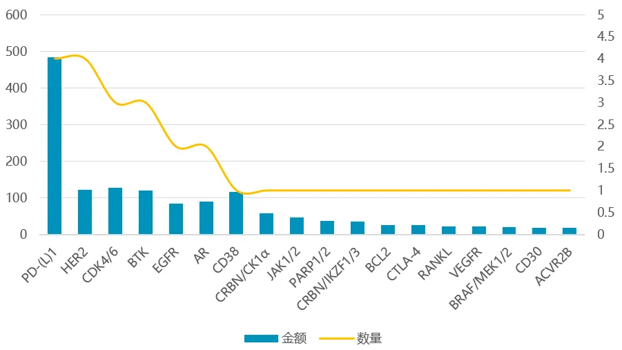 在一些患者群体庞大且相对垂直的靶点领域,深入耕耘也能取得优异成果,如HER2(乳腺癌/胃癌)、CDK4/6(乳腺癌)、BTK(血液肿瘤)、EGFR(非小细胞肺癌)、AR(前列腺癌)、CD38(多发性骨髓瘤)等成熟靶点持续产出重磅药物,而这些赛道的角逐也相对激烈。