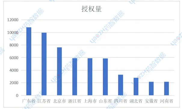 中部及新兴区域分化明显:浙江省、上海市、山东省组成第二梯队,其中浙江省授权量同比降低达33.68%。四川省、湖北省作为西部及中部代表,授权量同比降低37.68%、41.30%,可见各省份授权量呈下降趋势。