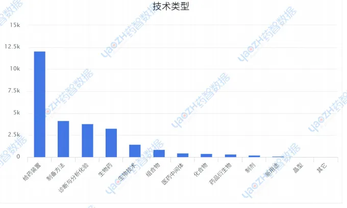 从图2技术类型柱状图可以看出,给药装置以约12,500件专利授权量断层领先,占总量比例超43%,成为本季度技术创新的核心方向。其爆发性增长与老龄化社会慢性病管理需求激增、智能医疗设备技术迭代密切相关,例如微针贴片、可穿戴式胰岛素泵等新型装置加速布局。