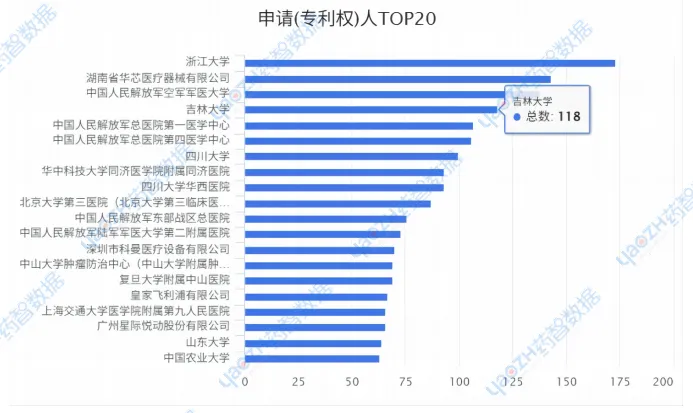 图3专利权人top20数据显示,专利权人TOP20呈现“高校主导、多元参与”的创新格局。浙江大学以显著优势位列榜首,彰显其在医药研发领域的顶尖实力;吉林大学紧随其后,两者合计占比超TOP20总量的30%,凸显高校在基础研究与技术转化中的核心地位。