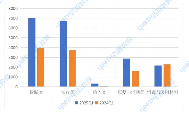 2025年第一季度中国医疗器械专利授权量数据显示,与2024年同期相比,诊断类、治疗类及植入类器械的授权量增幅显著,而消毒与医用材料领域则进入平稳发展阶段。