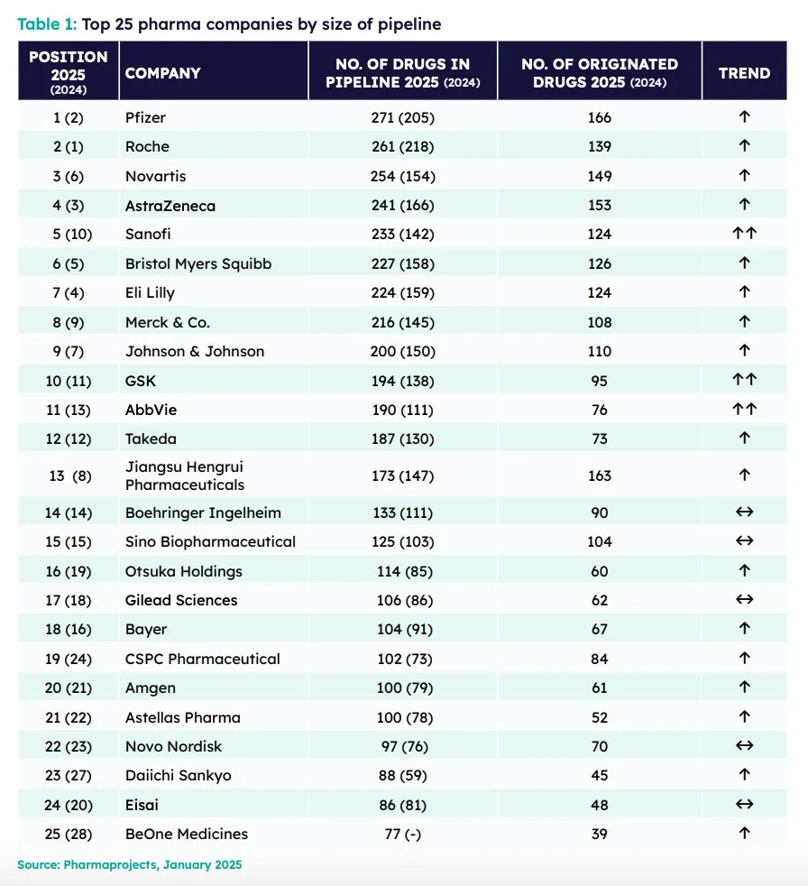自主创新能力的质变式提升,已成为中国制药企业在全球最显著的竞争优势。从Pharmaprojects所统计的数据来看,对比上年同期,TOP25阵营中恒瑞以绝对优势(163项)领跑自研管线榜单,中生制药(104项)与石药集团(84项)同样表现亮眼,其自主研发规模甚至已超越艾伯维、武田等跨国制药巨头。