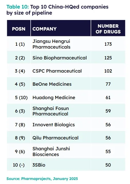其中,恒瑞众望所归,虽然排名上从第8位滑落到第13位,但仍是榜单中排名最靠前的中国药企,其自研管线数量也猛增30项,在全球仅次于辉瑞;另外,中生制药仍保持原有位次,石药集团由第24名跃升至第19名,百济神州也成为了榜单新客。遗憾的是,复星今年并未进入TOP25阵营。