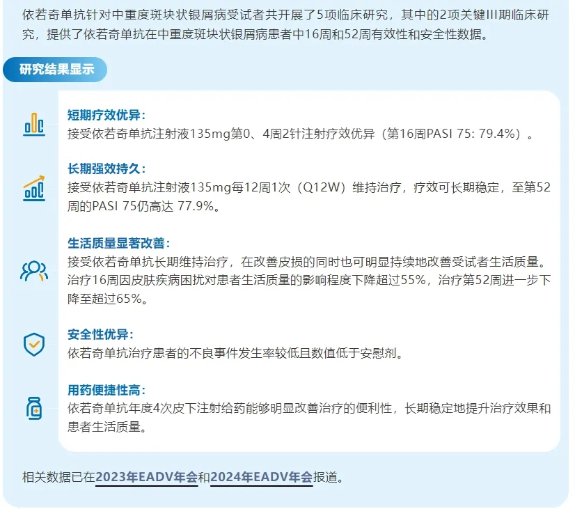 同为IL-12/IL-23双靶向且人源化的银屑病抗体药物,依若奇单抗被认为是可与乌司奴单抗正面硬刚的有力对手,其一年仅需4次皮下注射的给药周期,也成为提高患者用药依从性、降低治疗费用的优势之一。