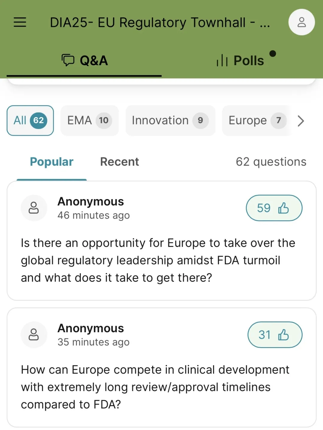 我作为DIA全球董事,参加了于2025年3月18-20日在瑞士巴塞尔举行的DIA欧洲年会。在欧盟药监局(EMA)专场上,听众给EMA局长Emer Cooke的两个问题尤为瞩目(见图):(1)在美国FDA陷入动荡之际,欧洲是否有机会接过全球监管领导权?实现这一目标需要具备哪些条件?(2)在审评/批准周期远长于FDA的情况下,欧洲如何在临床开发方面保持竞争力?