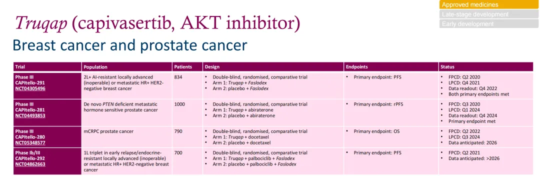 Truqap正在进行二线治疗转移性去势抵抗前列腺癌(mCRPC)的CAPItello-280三期研究和一线治疗晚期HR+/HER2-乳腺癌患者的CAPItello-292三期研究,均在2026年前后读出关键数据,如果两个早线适应症三期临床均获得成功,那么其将预定一个全球重磅炸弹的名额。