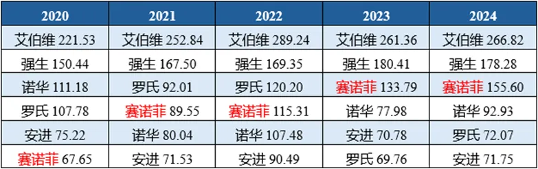 2020-2024年赛诺菲免疫业务排名(亿美元)