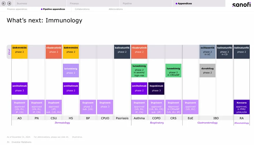 自2020年启动“全力致胜(Play to Win)”战略以来,赛诺菲对自身业务进行了大刀阔斧的改革,将资源向免疫学和炎症领域倾斜。凭借Dupixent(度普利尤单抗)的爆发式增长以及厚实的免疫家底,这家法国制药巨头已在新的治疗领域跻身第一梯队,与艾伯维和强生并称“免疫三巨头”,战略转型成效显著。