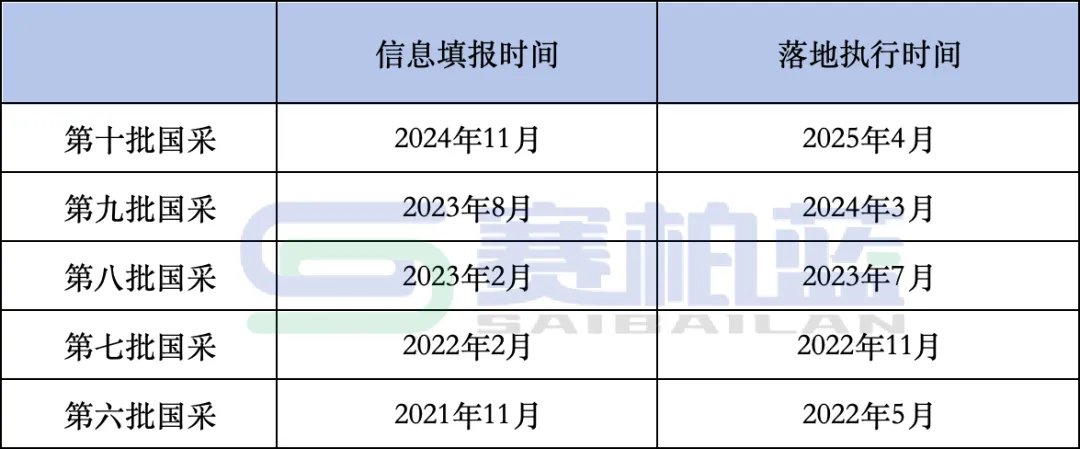 赛柏蓝梳理发现,近五批国采官宣信息填报时间与上一批次国采落地时间最快间隔约3个月,最慢在一年左右,如果按此推算,上半年进行的新批次国采可能会在6月进行信息填报。