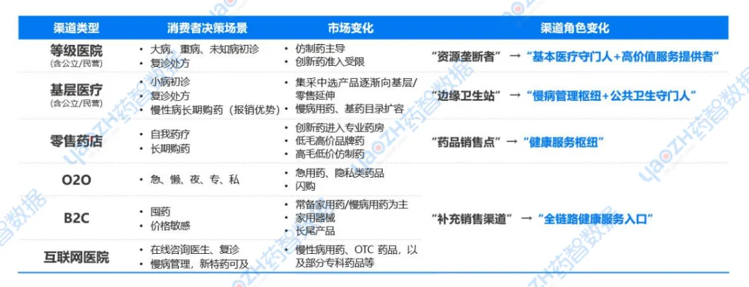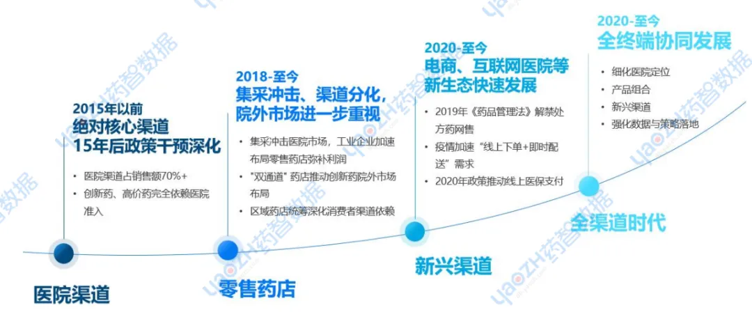 2015年以前,医院渠道占药品销售额的70%以上,创新药、高价药完全依赖医院准入,政策对医院渠道的干预不断深化,整个行业呈现明显的“医院依赖”特征。2018年以后,集采政策冲击医院市场,渠道分化加剧,院外市场价值凸显。到了2020年,电商、互联网医院等新生态快速崛起。2019年《药品管理法》解禁处方药网售,叠加疫情催生“线上下单+即时配送”需求,2020年线上医保支付政策落地,在整体政策松绑,疫情催生的节奏下进一步推动新兴渠道发展,医药行业正式迈入全渠道时代。