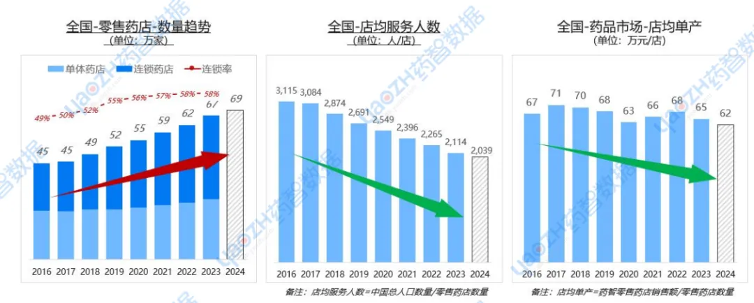 全国零售药店数量逐年递增,连锁化加速,推动零售药店市场集中度提升,但过度扩张导致单店服务人数和销售额双双下降,行业需警惕“量增利减”的结构性矛盾。