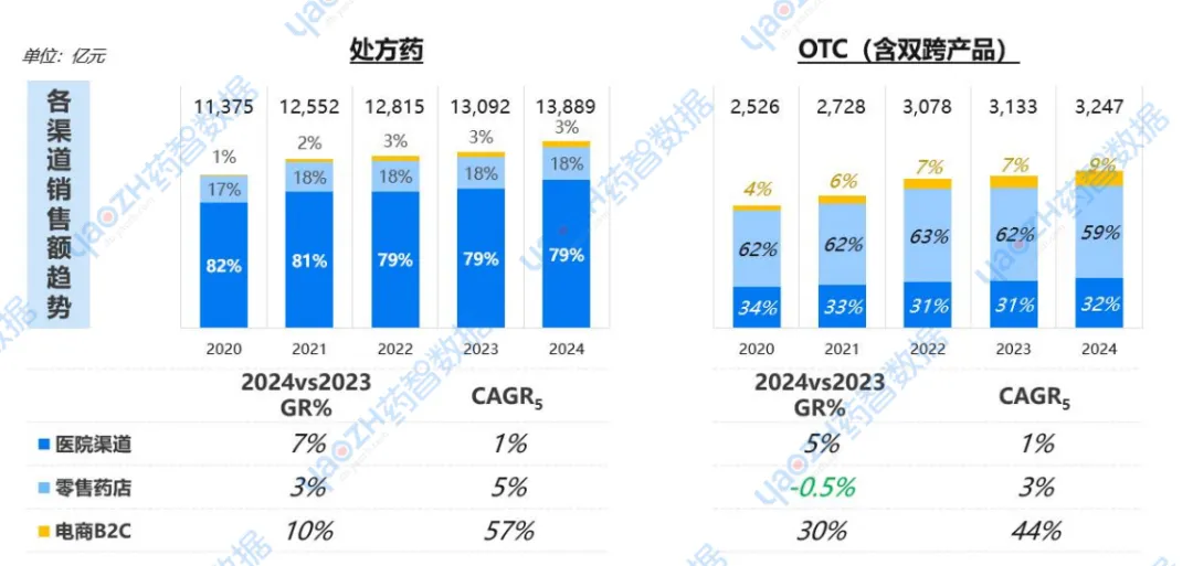 按照药物处方属性来看,可以发现处方药为传统渠道(医院+零售)的核心驱动品类;而OTC线下基本盘稳定,线上化趋势更为显著。