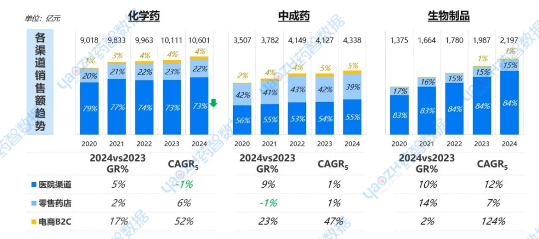 按照药物中西药属性来看,化学药市场规模虽持续增长,但院内市场受到集采影响,份额由79%降至73%,使其逐步转向院外市场。中成药线上化趋势显著,电商占比逐年递增;生物制品各渠道快速发力,引领增长。