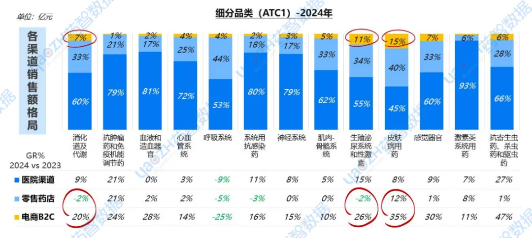 按照不同细分品类来看,品类特性的差异也使其在渠道结构显示出差异;其中消化道类/泌尿系统类/皮肤类自我药疗领域且具备一定消费属性的品类线上化显著。消化道类药物在电商B2C渠道增长率达20%,皮肤病用药更是高达35%。仅有呼吸系统药物在全终端所有渠道处于下滑趋势,而抗肿瘤药和免疫机能调节药在所有渠道都保持高速增长。