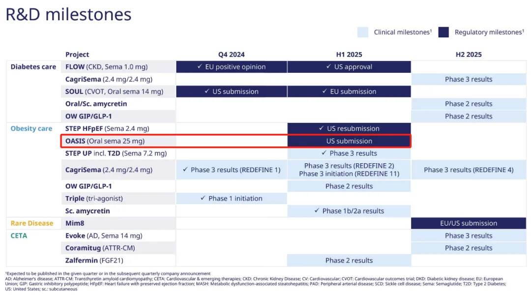 ”已提交用于超重和肥胖症的口服司美格鲁肽25mg的申请,这与2024Q4财报中里程碑事件预计发生的时间相吻合。诺和诺德还表示,该申请代表
