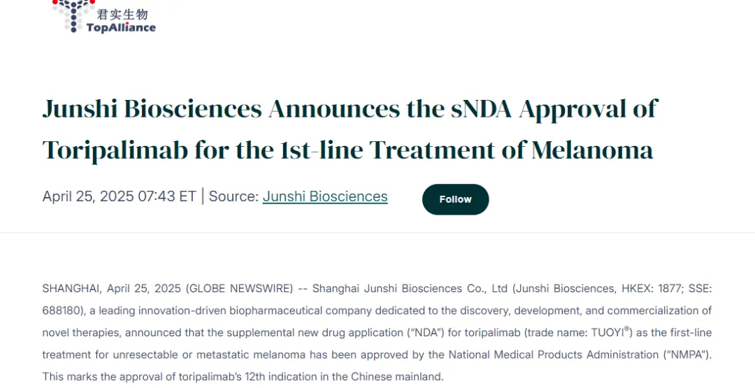 一季度,君实生物核心产品特瑞普利单抗(拓益)国内销售收入4.47亿元,同比增长45.72%。特瑞普利单抗注射液是中国首个批准上市的以PD-1为靶点的国产单抗药物。4月25日,君实生物宣布特瑞普利单抗注射液(拓益)新适应症上市申请获国家药监局批准,用于不可切除或转移性黑色素瘤的一线治疗。据介绍,这是特瑞普利单抗国内获批的第12项适应症。