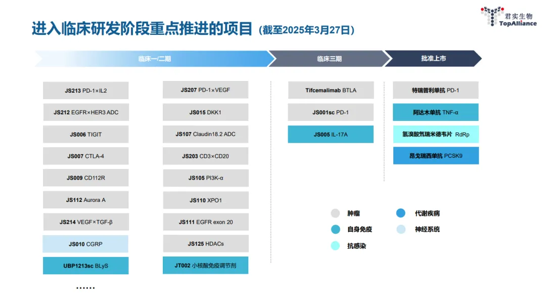 目前,君实生物正在加快推进抗BTLA单抗cemalimab(TAB004/JS004)、抗IL-17A单抗(JS005)、PD-1/VEGF双抗(JS207)等后期阶段管线的研发。早研管线亦储备不少潜在重磅产品,包括抗 Claudin18.2 ADC(JS107)、PI3K-α口服小分子抑制剂(JS105)、抗CD20/CD3双特异性抗体(JS203)、抗DKK1单抗(JS015)等早期阶段管线。君实生物计划于2025年推动多款管线进入关键注册临床。