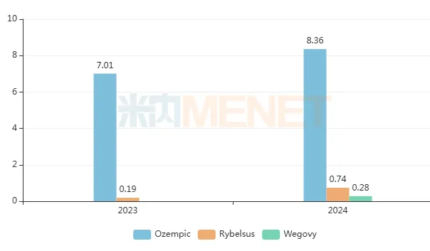 诺和诺德在2024年中国市场营收达26.85亿美元,同比增长13%,占其全球总营收的6.37%。诺和诺德在GLP-1领域是第一梯队的强者,其王牌产品司美格鲁肽在中国市场已经获批并商业化有Ozempic(注射用降糖药)、Wegovy(注射用减重药)以及Rybelsus(口服降糖药)。三个剂型的司美格鲁肽在2024年销售额已超过9亿美元,同比增长30%,司美格鲁肽展现出的市场竞争力令人惊叹,对同类产品形成碾压性优势。