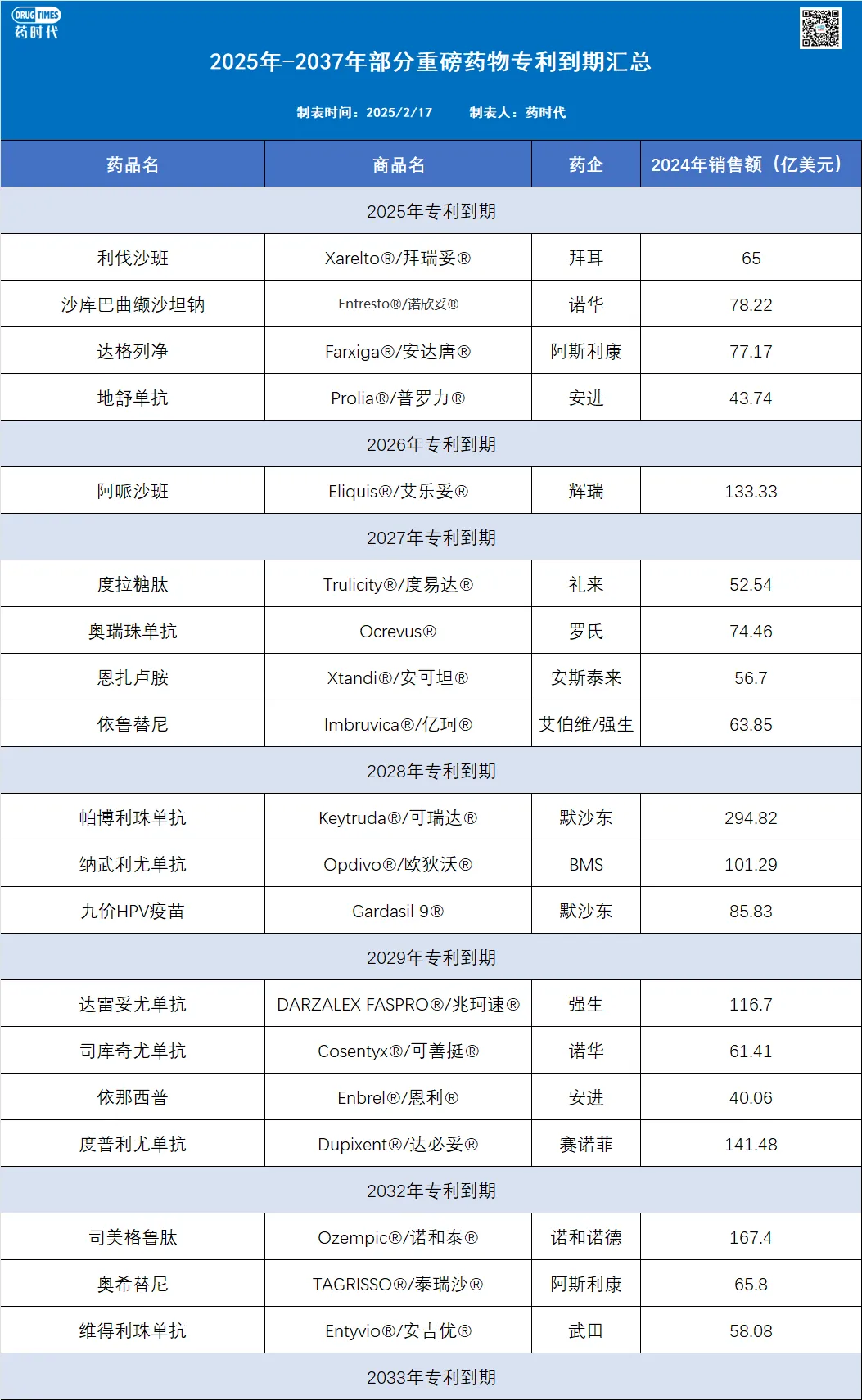 最后,报告中指出未来十年内专利到期的生物药中,90%尚未有生物类似药开发计划。此前,药时代罗列了部分重磅药物的专利信息。截止2037年,超25款产品将会面临专利悬崖,以2024年销售额为准,合计潜在损失金额超2364亿美元。