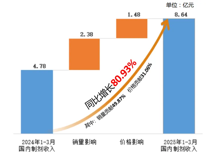 其中,基础胰岛素(长效)产品销售额5.43亿元,同比增长81%;餐时及预混胰岛素产品销售额3.21亿元,同比增长80.9%。销量增长贡献收入2.38亿元,价格提升贡献1.48亿元。